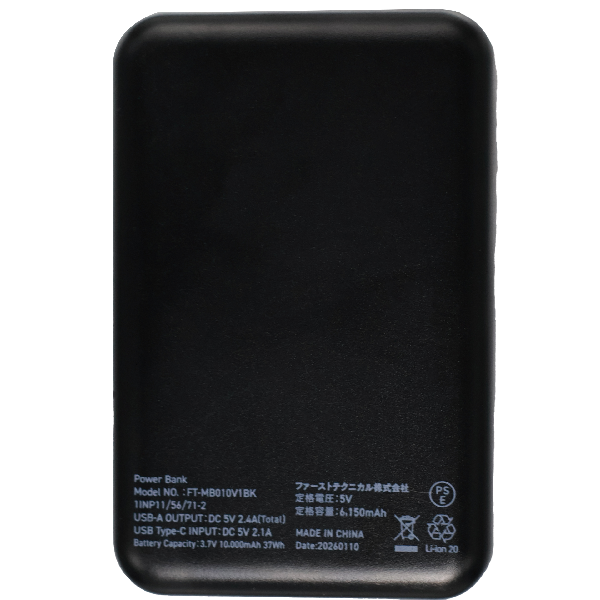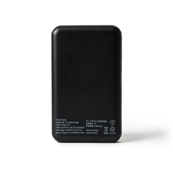 | 製品仕様 | 【内蔵電池】リチウムイオンポリマー電池 3.7V 10,000mAh 【入力ポート】 Type-C×1 【出力ポート】 USB-A×2 【入力】 Type-C:5V2.1A 【出力】 USB-A:5V2.4A (total) 【付属品】充電ケーブル |