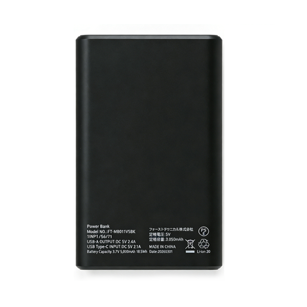 | 製品仕様 | 【内蔵電池】リチウムイオンポリマー電池 3.7V 5,000mAh 【入力ポート】Type-C×1 【出力ポート】USB-A×1 【入力】Type-C:5V2.1A 【出力】USB-A:5V2.4A 【付属品】充電ケーブル |