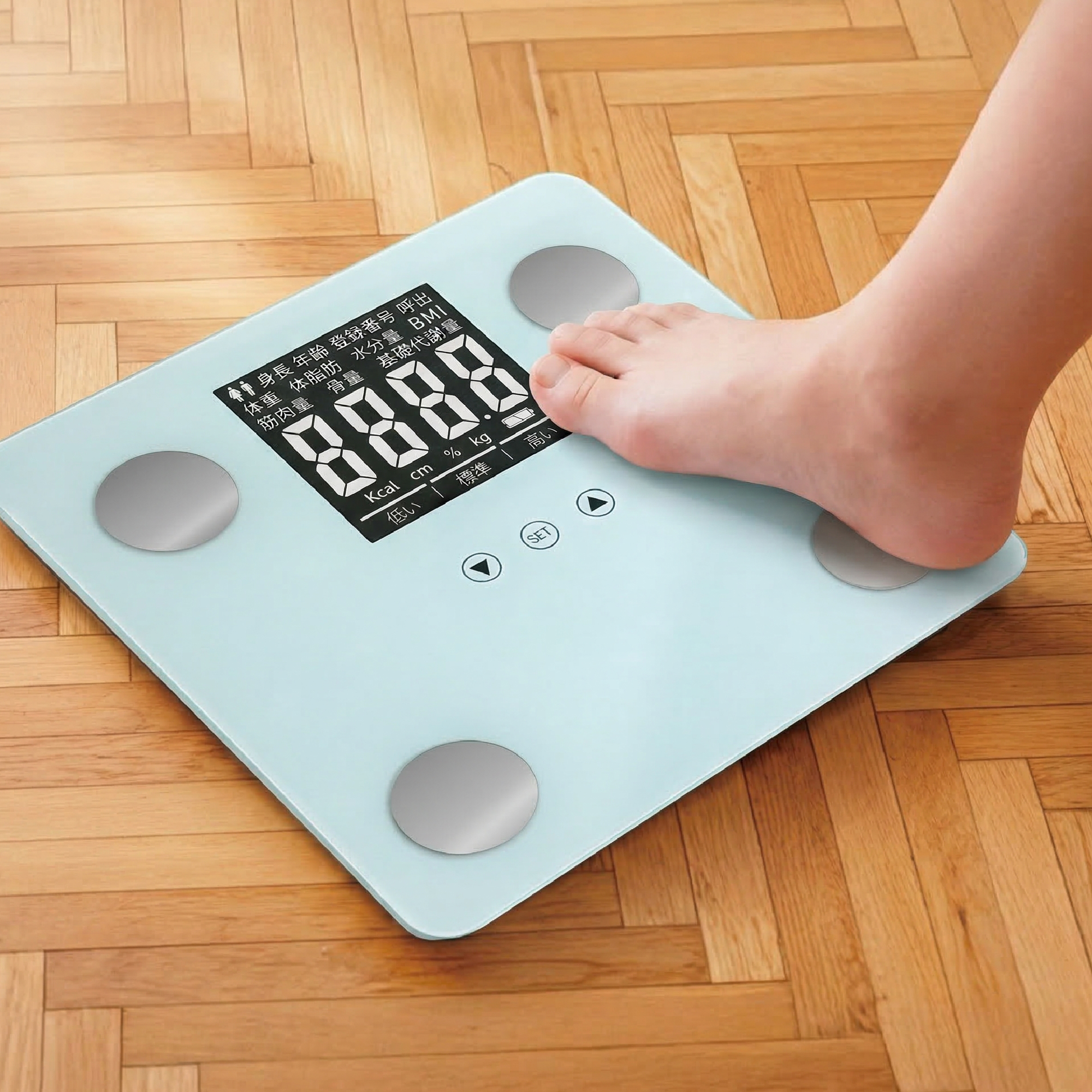 | 製品仕様 | 電源:単4形乾電池(1.5V)×3本 ※電池は付属しておりません 計量範囲:3~180kg 体重計精度:3~90kgまで:±100g 90超え~180kg:±500g 体重表示·単位:3~90kgまで:100g単位 90超え~180kg:500g単位 体脂肪率表示·単位:5.0~60.0%:0.1%単位 体脂肪率判定:低い/標準/高い 体水分量表示·単位:20.0~80.0%:0.1%単位 筋肉量表示·単位:25.0~75.0%:0.1%単位 推定骨量表示·単位:1.0~10.0%:0.1%単位 基礎代謝量表示·単位:500~5,000kcal:1kcal単位 BMI表示·単位:0.1単位 設定項目 ・登録人数:10名 ・身長:100~240cm ・年齢:10~99才 ・性別:男性/女性 |