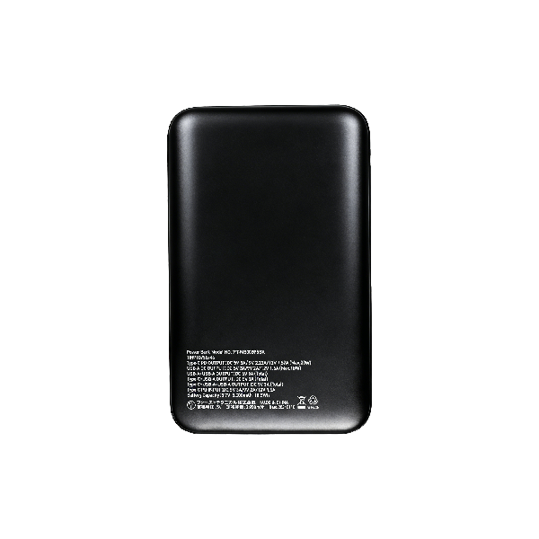 | 製品仕様 | 【内蔵電池】リチウムイオンポリマー電池 3.7V 5,000mAh 【入力ポート】 Type-C×1 【出力ポート】 Type-C×1 USB-A×2 【入力】 Type-C PD:5V3A,9V2A,12V1.5A 【出力】 Type-C PD:5V3A,9V2.22A,12V1.67A USB-A QC:5V3A,9V2A,12V1.5A USB-A+USB-A: total 5V3A Type-C+USB-A: total 5V3A Type-C+USB-A+USB-A: total 5V3A 【付属品】充電ケーブル |