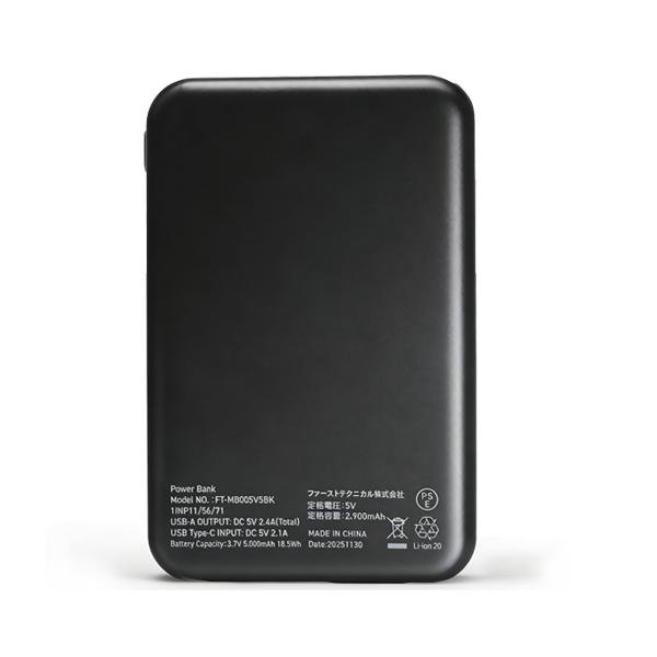 | 製品仕様 | 【内蔵電池】リチウムイオンポリマー電池 3.7V 5,000mAh 【入力ポート】Type-C×1 【出力ポート】USB-A×2 【入力】Type-C:5V2.1A 【出力】USB-A:5V2.4A(total) 【付属品】充電ケーブル |